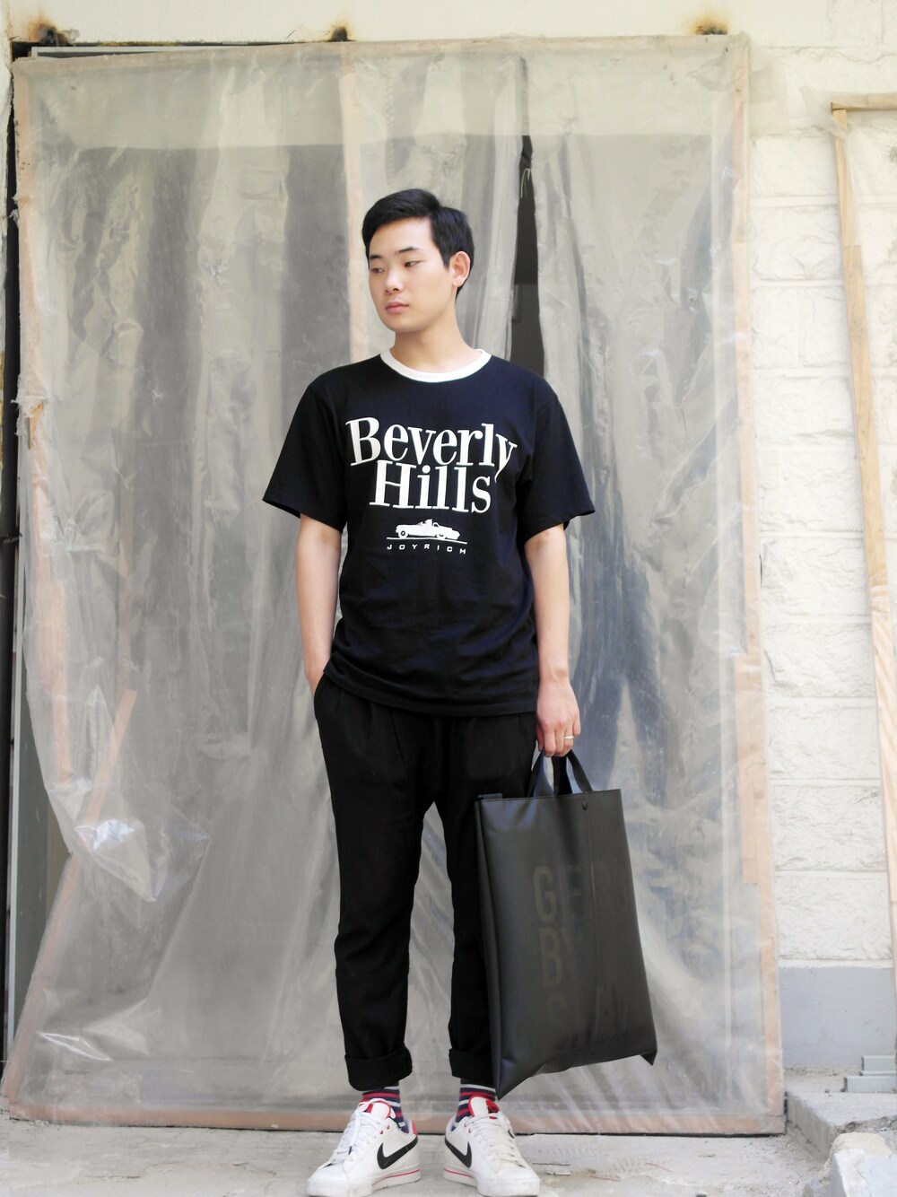 ブラック系のTシャツ/カットソーを着用したメンズの夏コーディネートの1枚目の写真