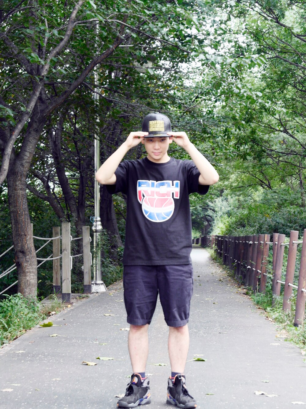 ブラック系のTシャツ/カットソーを着用したメンズの夏コーディネートの1枚目の写真