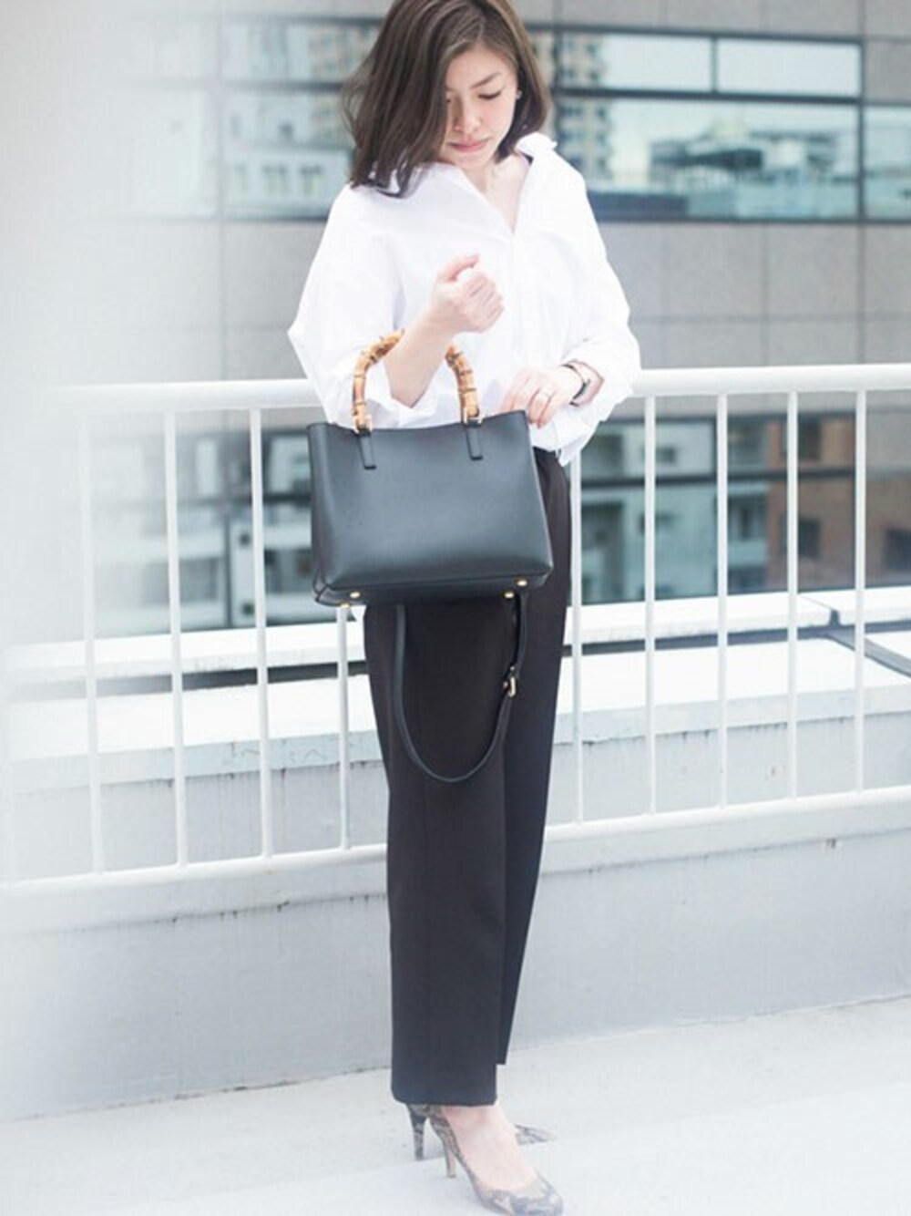 【オデット エ オディール/オフィススタッフ】 春を感じる通勤スタイル。トップスとボトムス、バッグのコーディネートはベーシックなモノトーンに統一しつつも、 パイソン柄のピンヒールのパンプスをアクセントに。足元から女性らしさを一気に高めてくれます。 【スタッフ着用レビュー】 身長:161cm サイズ:23cm サイズは23cmを履いて丁度良いフィット感です。新鮮なラウンドトゥデザインと絶妙なカットラインで足元がすっきりと見えます。パイソン柄でもハードになり過ぎず、シンプルなスタイリングのアクセントになるおすすめのパンプスです。