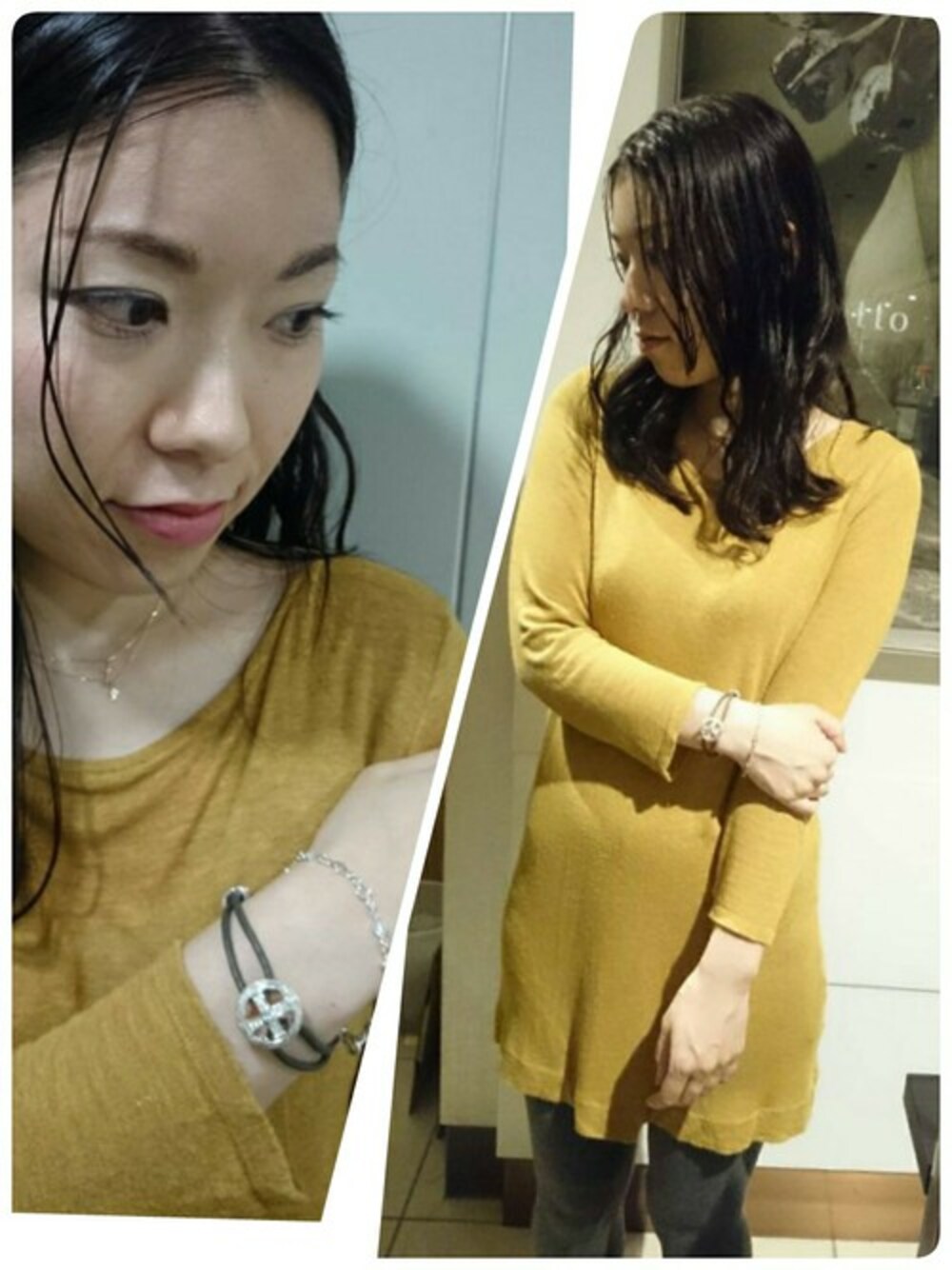 ローリーロドキンの人気デザインチェーンと、コードブレスレットを組み合わせて手元に存在感を持たせました。
