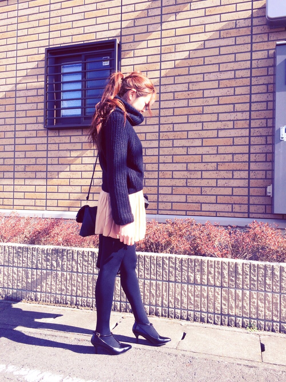 ブラック系のパンプスを着用したレディースの冬コーディネートの1枚目の写真