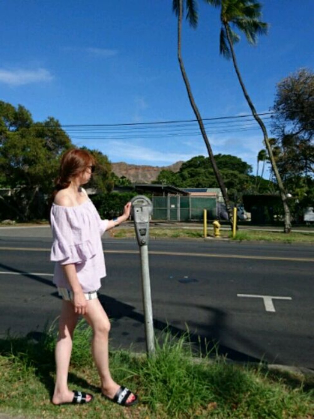 オフショルのトップスはひとめぼれ♡♡ こーゆう薄いパープルだいすき! パンツもなにげに着まわせるので買って良かったやつꉂꉂ😀 たくさん歩く予定だったのでぺたんこシャワーサンダルでꉂꉂ😀😀