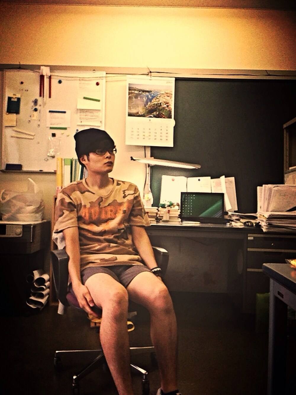 おもろいポーズとか特に思いつかん。 AVIREXのカモ柄ほんと好き。 お盆もずっと研究室。 BGM…This life / Pay money to my pain