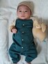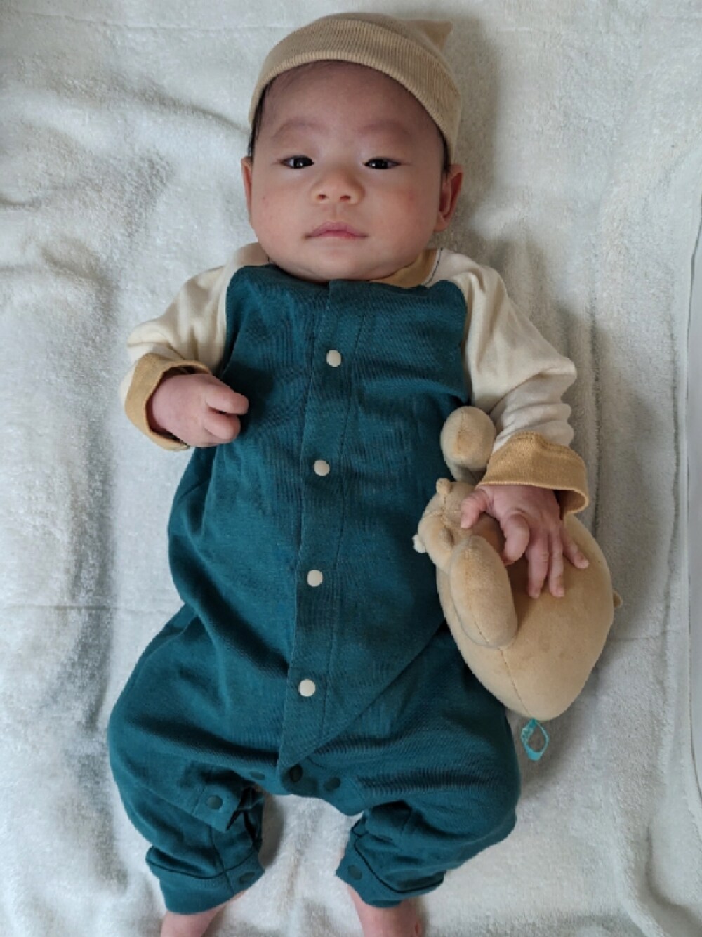産院でもらった帽子ギリギリだから今日かぶっとくコーデ ちょっとスタジャンぽいデザインのロンパース
