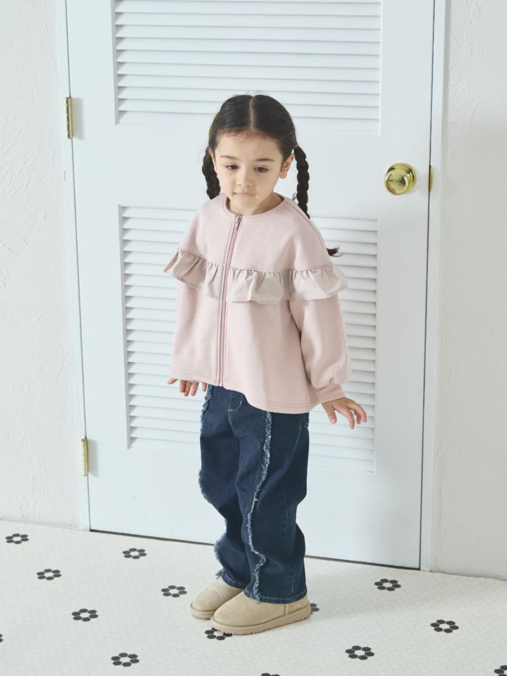 裏起毛 フリル付き ノーカラー ジップブルゾン ■モデルサイズ:108cm 着用サイズ:110