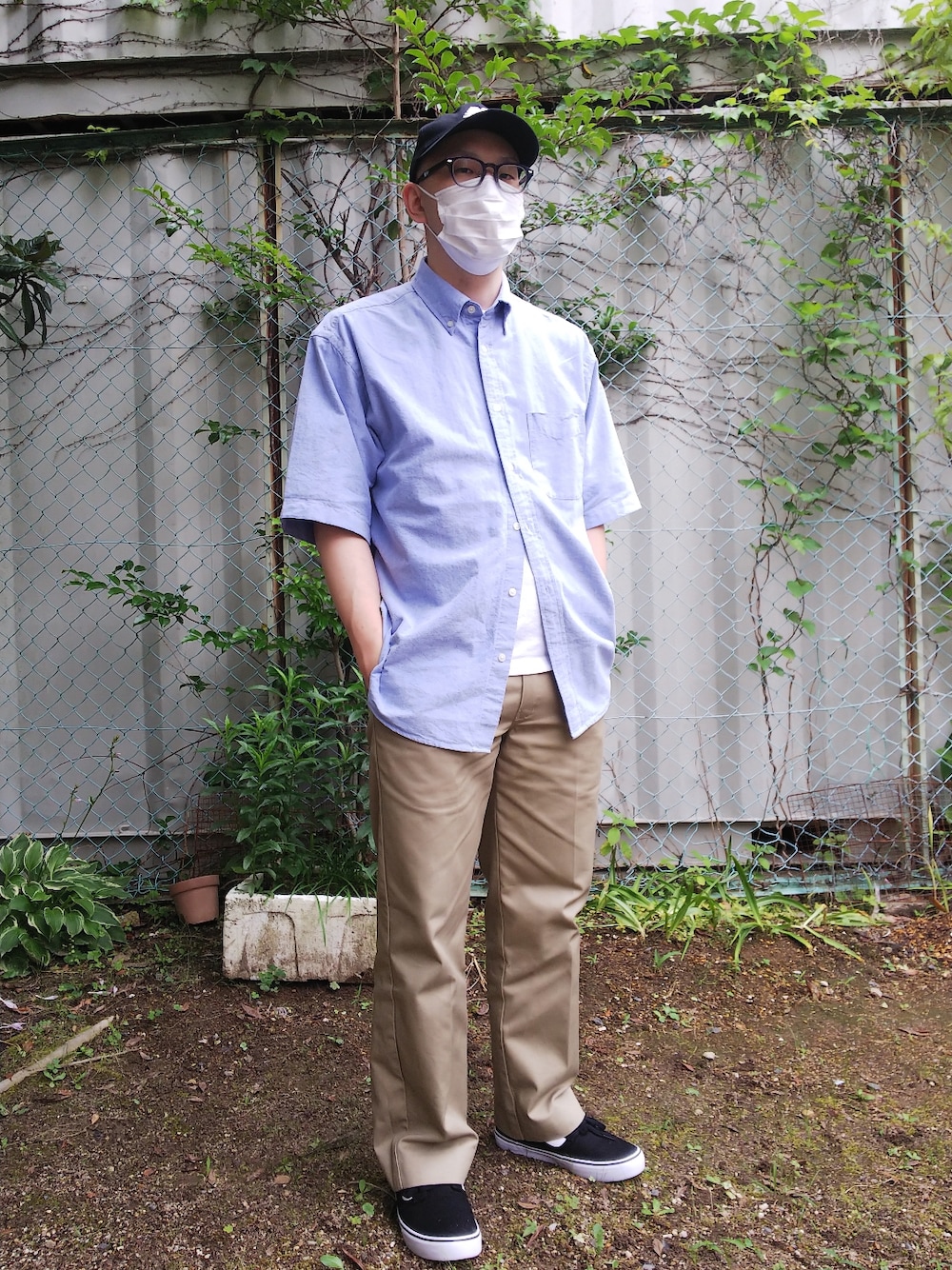 ご覧いただきありがとうございます。 少し大きめなブルーのシャツに合わせたふとめのカーキのDickies874とVANSのシンプルな黒のスニーカーです。 Instagram→offodenon