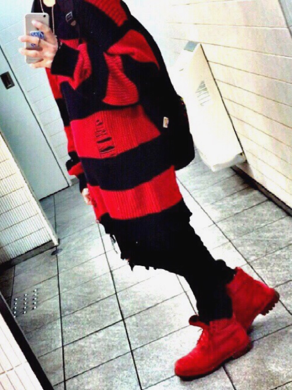 今年の冬に撮ったコーディネートです。 赤ボーダーのロングスリーブニット?と ダメージスキニー、赤ティンバを履いたコーディネートです。
