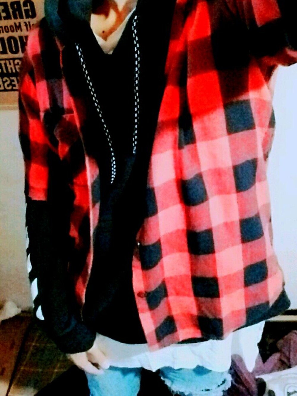 暇だったんで洋服をリメイク😁✨ 赤チェックを長袖から半袖にしました! 中はOff-Whiteですこし斜線が見えるようにコーデ!