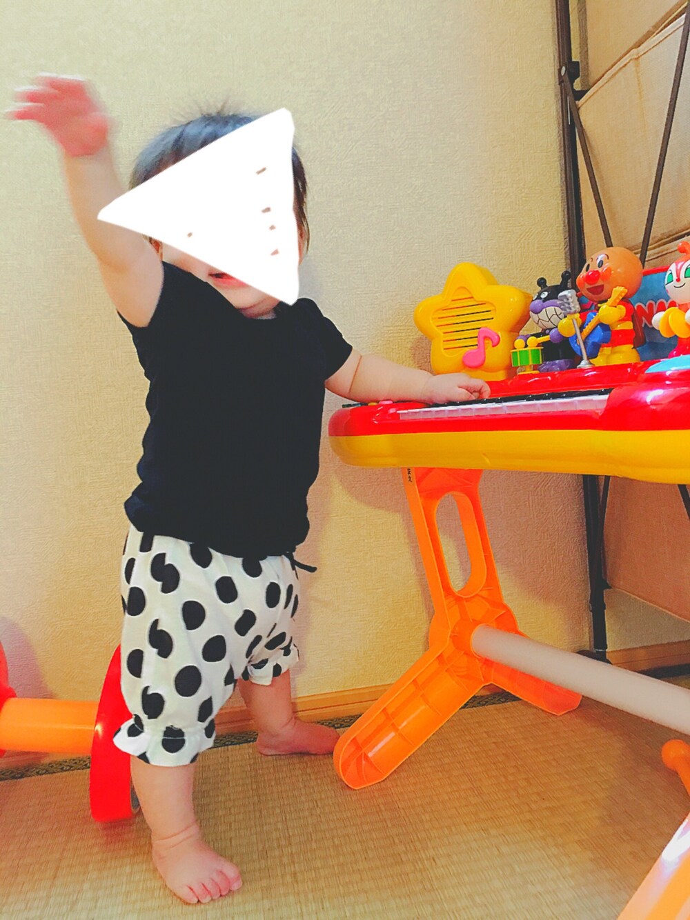 黒T新調しました。2枚目です。 バースデイの水玉かぼちゃパンツは380円で即買い! 甥っ子のおもちゃで遊ぶ娘さん😌🎵 楽しそう❤️