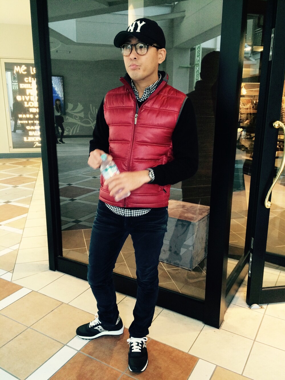 ジャズドリーム長島にて( ^ω^ ) この後に、なばなの里イルミネーション(^o^)/ ネイビーコーデュロイ エンジ色ダウンベスト 配色にギンガムチェック