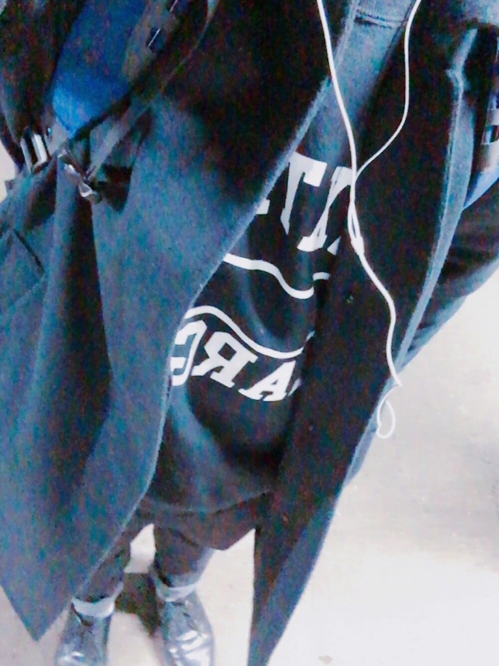 キレイめに見せるために、ソックスチラ見せ、ロングコート、Dr.Martensの3ホールで定番のコーデに、あえてスポーティーXLARGEのキャップを被って遊び心を入れました。