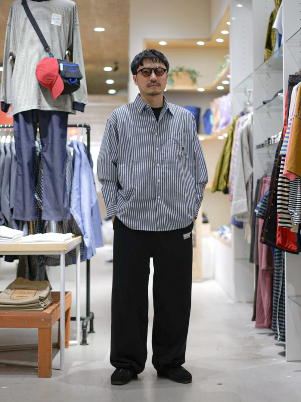 リラックス感のあるスウェットにキレイなシャツを合わせてメリハリをつけました。