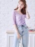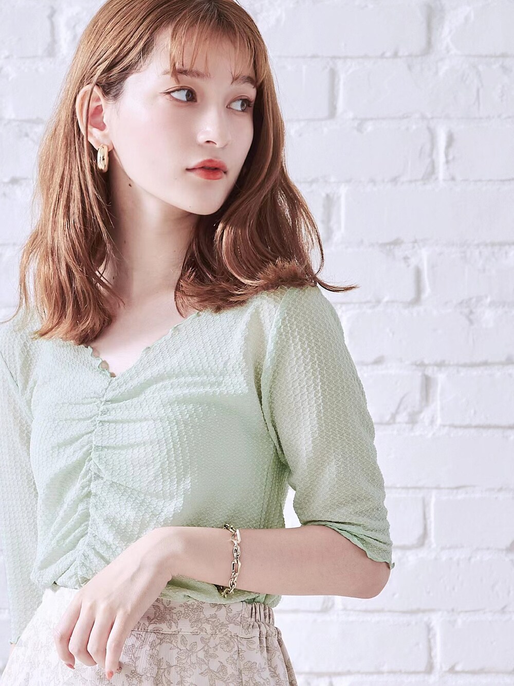 acro store Co.LtdのTシャツ/カットソー「シャーリングデザイン5分袖メロートップス/AC1399」を使ったコーディネート