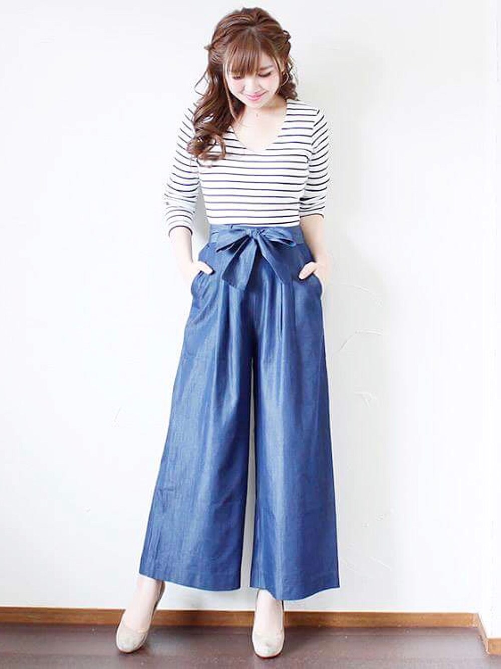 テンセルデニムのワイドパンツが主役のコーデ。