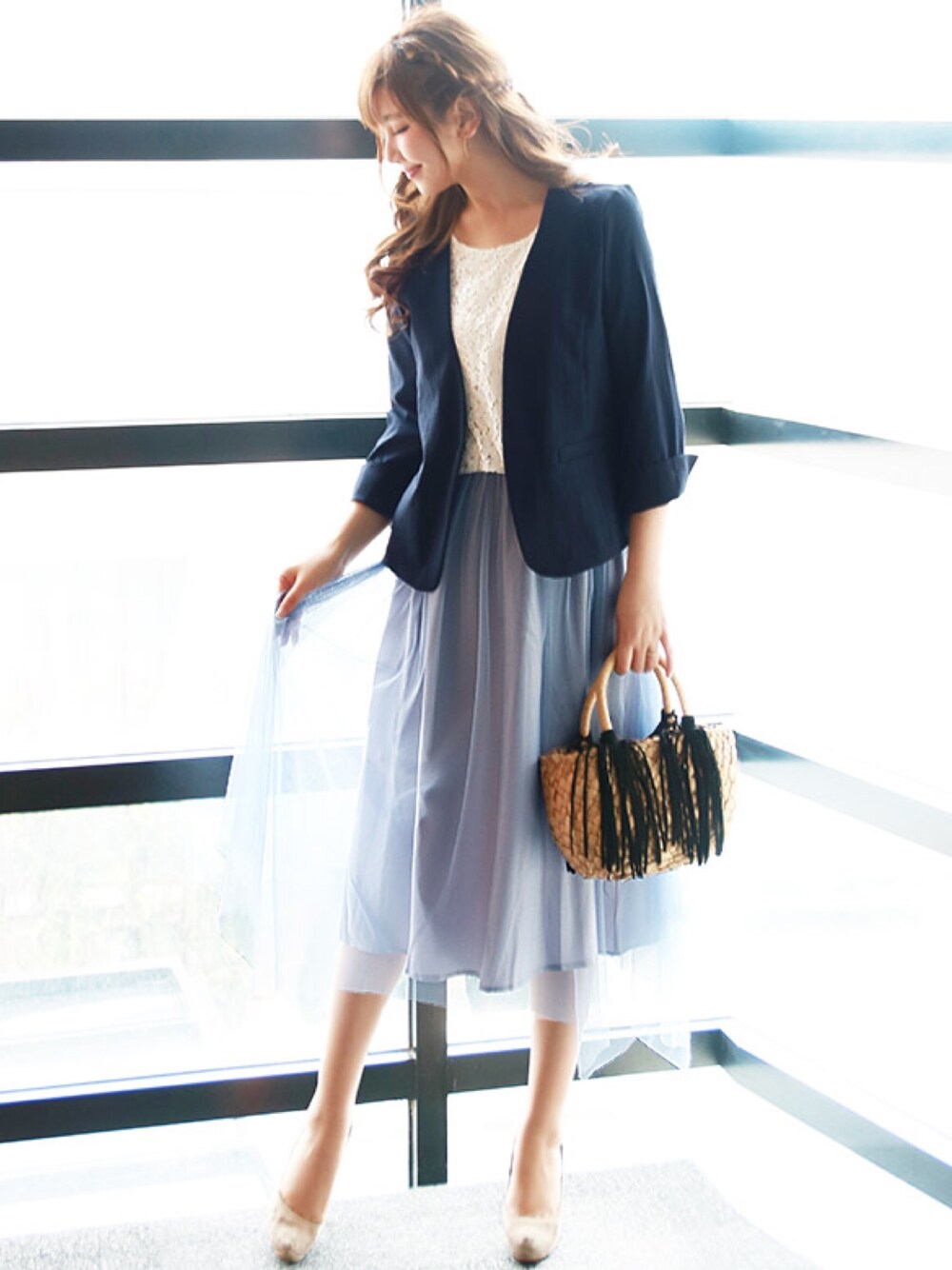 ふんわりチュールワンピにジャケットを羽織ってオフィスコーデに✒️一枚羽織るだけでチキンと見える、、、かな?