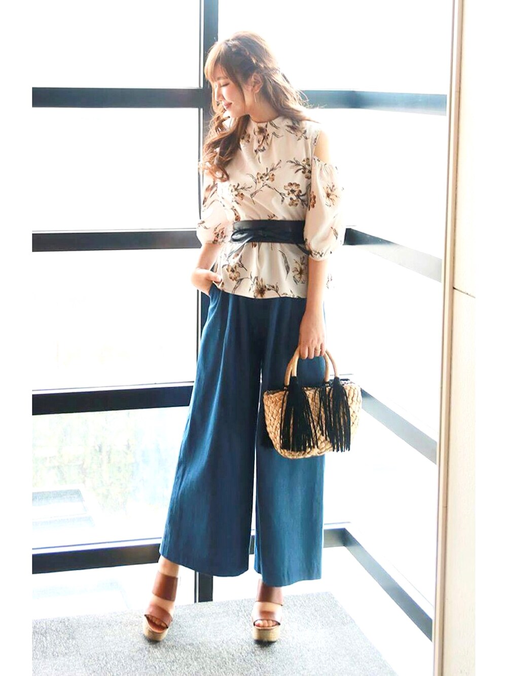 トレンドの肩開きブラウス×ワイドパンツ。 サッシュベルトで視線を上に上げて、 スタイルupして見せる詐欺コーデ😎