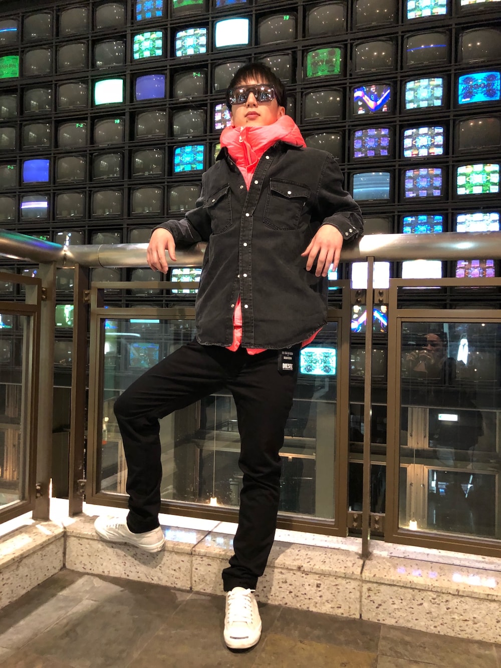 ピンク色のベストをあえて中に着ています!サングラスは40周年を記念して、販売されている物です! 今回は宇宙感満載のコーディネートになっています。