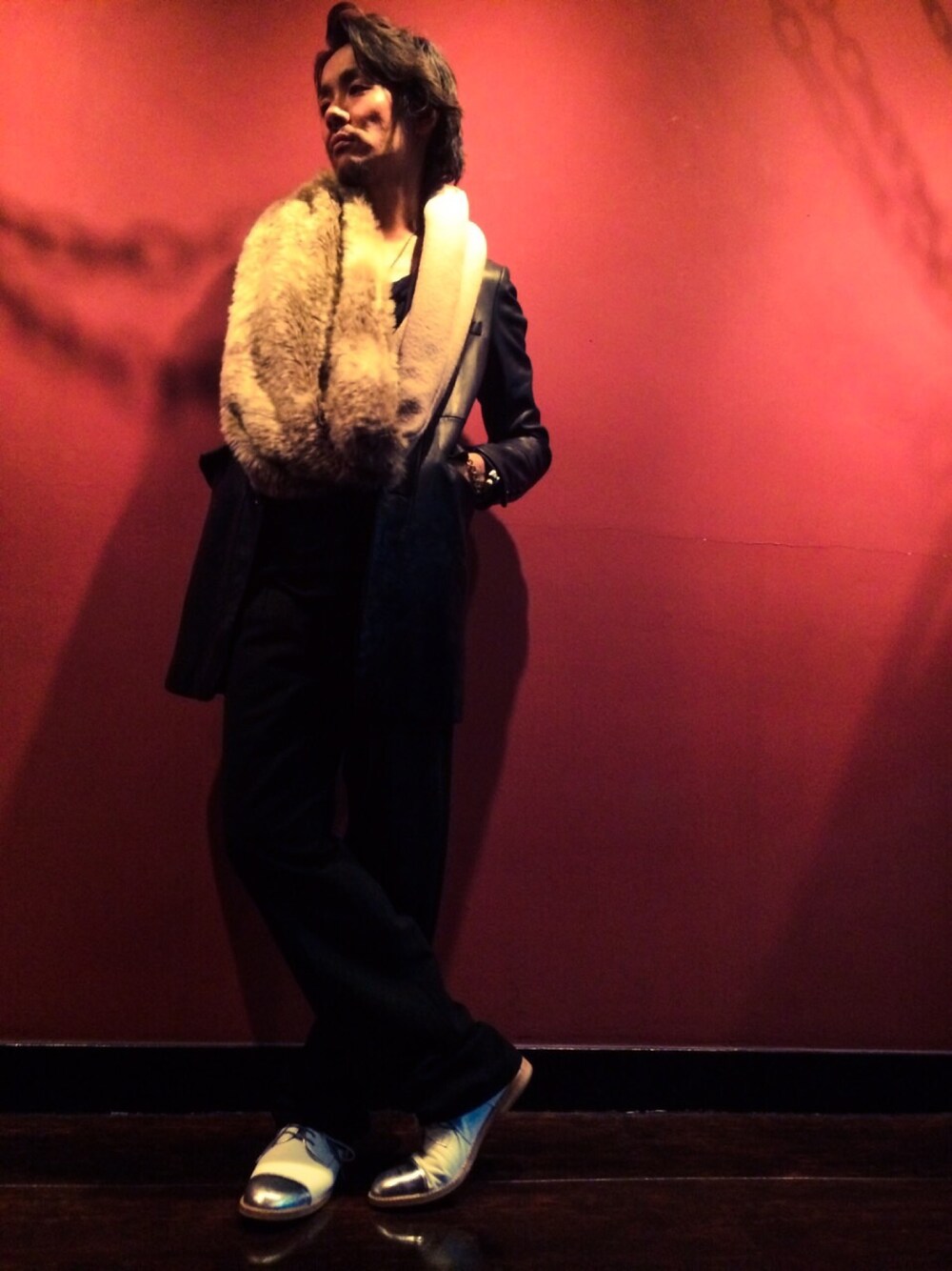 チェスターコートはあえてのレザー!スヌードはバンビのファーでゴージャスに。パンツは太めでAラインを!