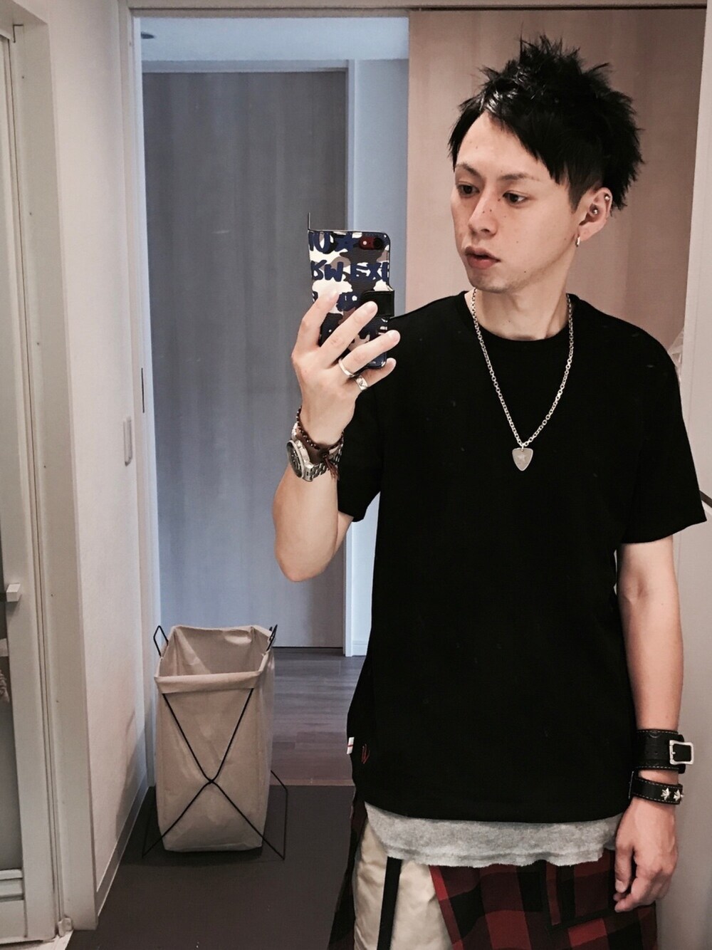 夏なので髪をばっさり切り 黒い無地Tに小物多めで。 赤いiPhone7に変更して カバーも新調📱