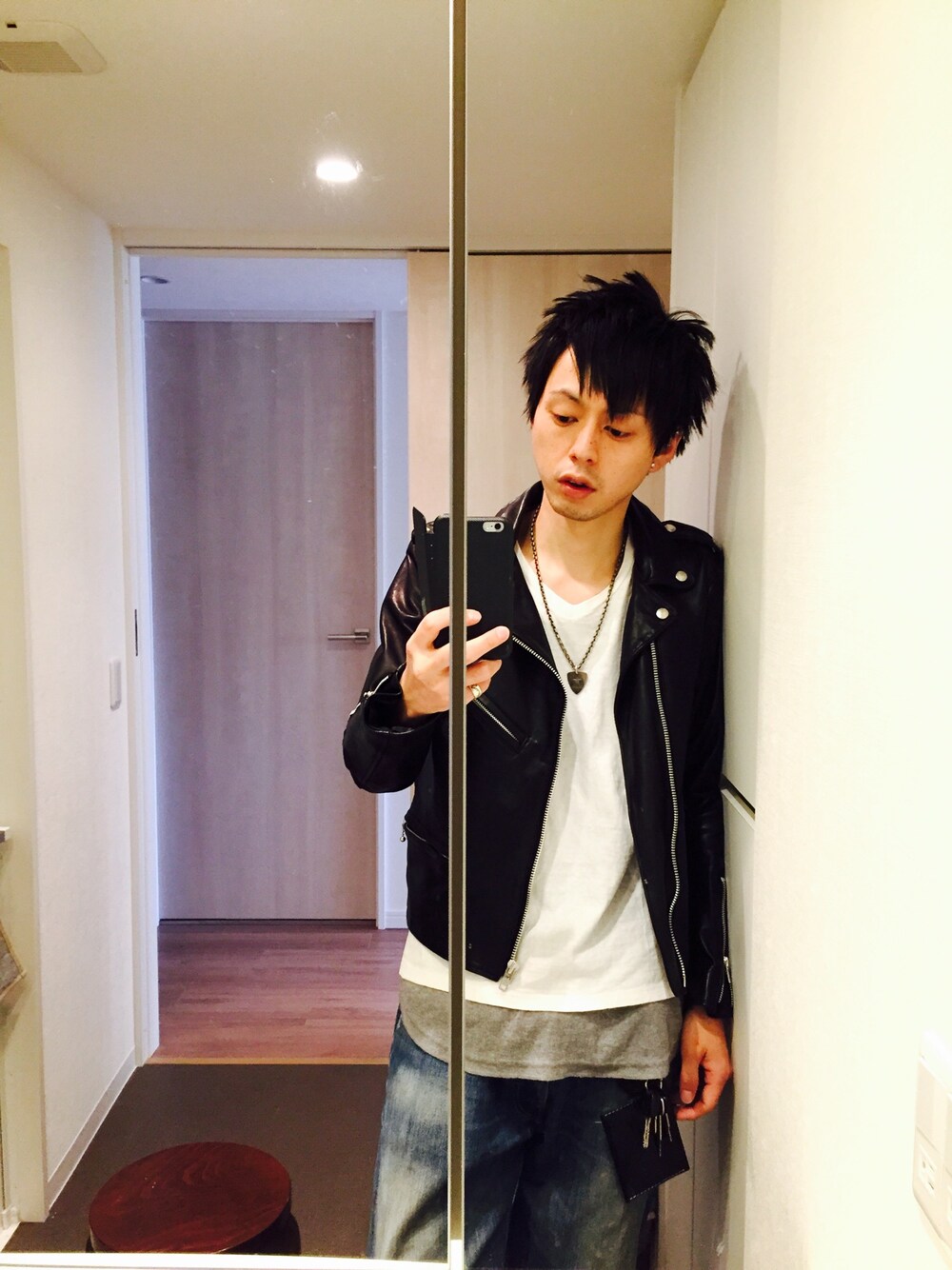 日曜日の昼下がり、クズ感丸出しで選挙へ。 Tシャツの上からざっくり羽織るライダースもまた調子いいです。