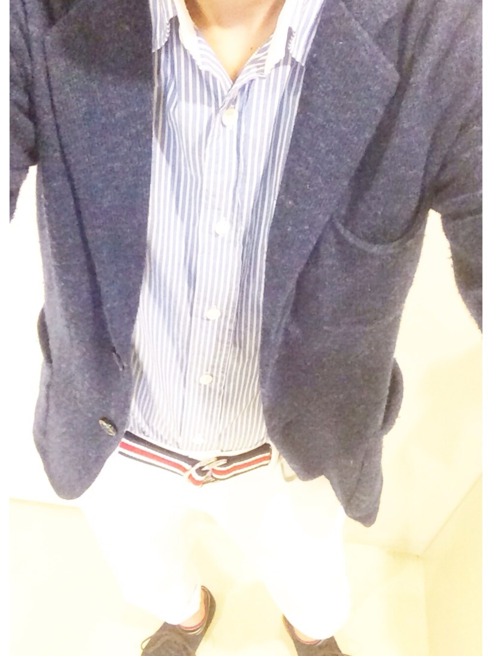 爽やかさ意識の青×白コーデ。 ポイントはベルトと足元の色合わせです。