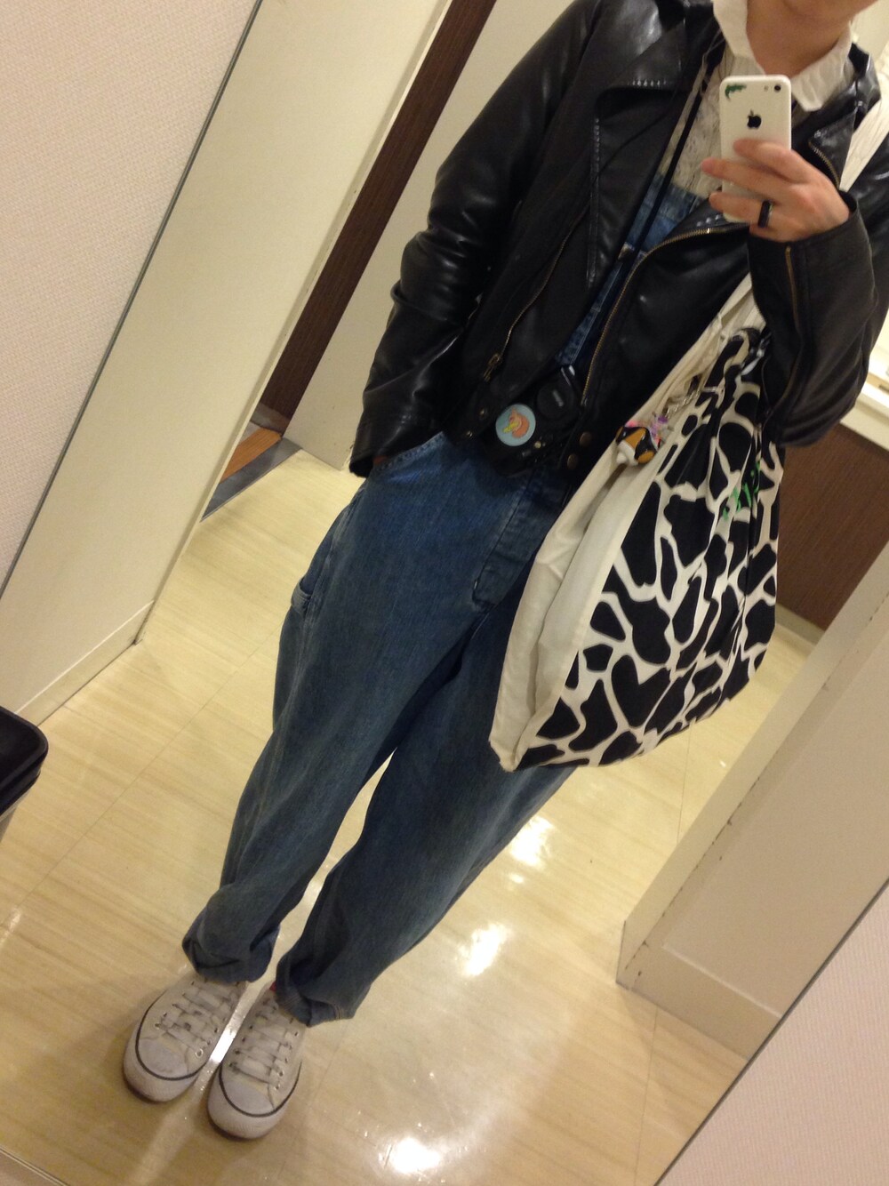 ギンガムチェックのタイツ履いたんだけど 全然見えてません。 ・ライダース:古着 ・オーバーオール:古着 ・シャツ:ばあちゃんの