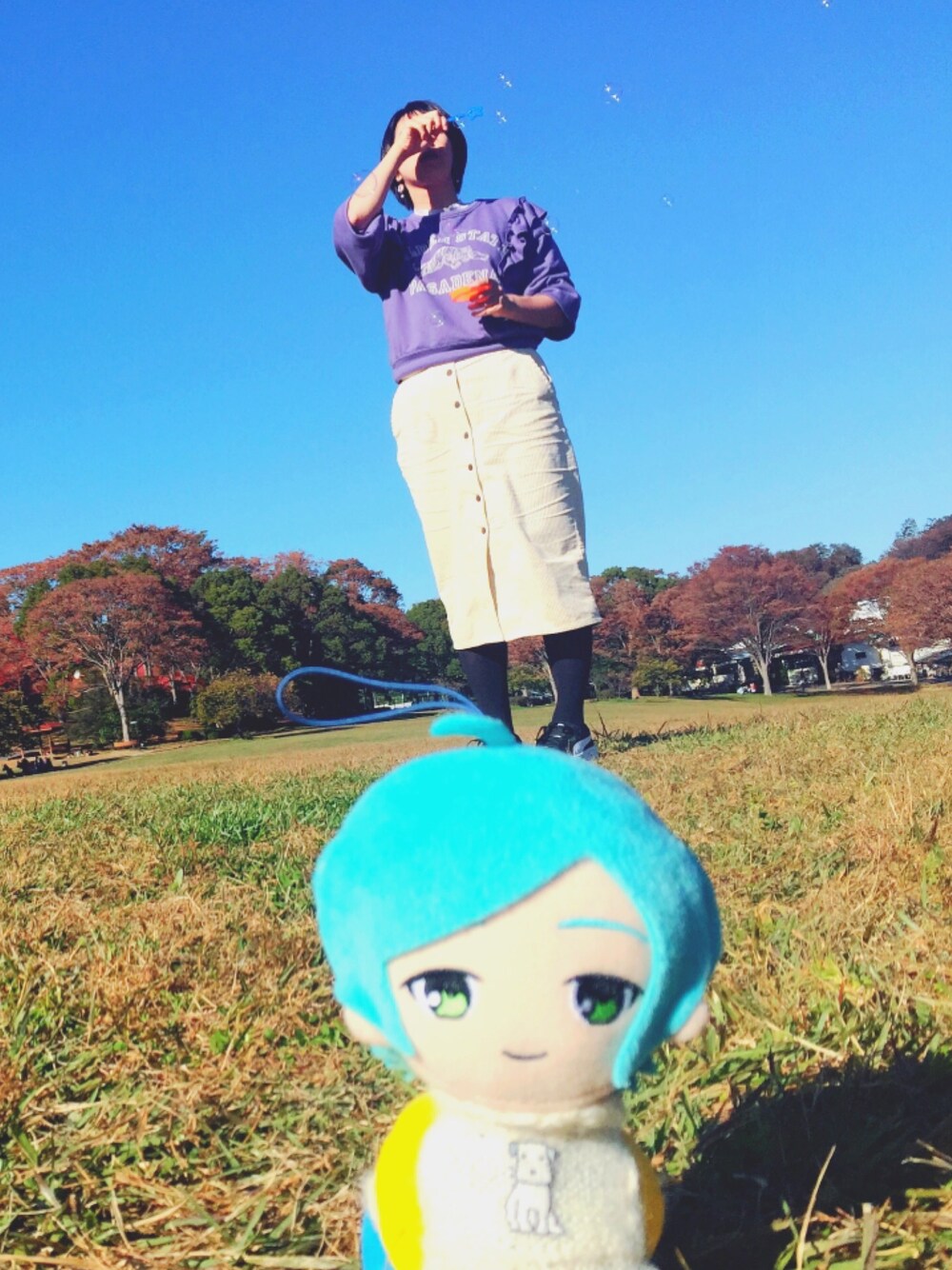 友達のぬい君とシャボン玉をするわたしです