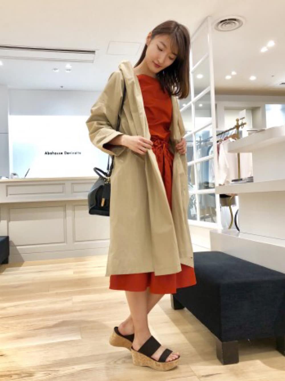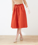 女性らしい同素材のレッドアイテムで揃えて、ワンピース風。 フロントギャザーのスカートはウエストがスッキリするので嬉しいです。