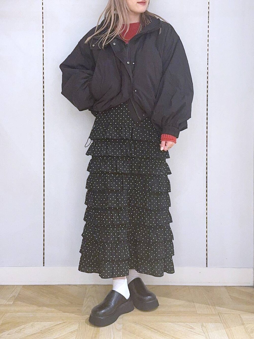▶︎アウター 去年も大人気やったモンスターショートコート✨ 丈感が短めなのでスッキリ着れました!! あたたかくてとにかく軽いので、 とっても使いやすいです◎ 裾に絞りがついていて絞るとスッキリ着ていただけます! ▶︎スカート フリルがポイントのスカートです! 広がりすぎずストンと落ちているので、スッキリ着ていただけます^_^ ウエストはゴムなのでお腹周り楽ちんです👍🏻 も載せてます! ぜひご覧下さい💗