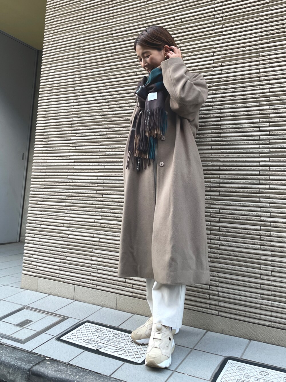 チェックのストールを合わせたラテコーデ☕️ しっとり艶のあるエレガンセーゼのストールはボリュームを程よく抑えられるので小柄女子にもしっくり🙆♀️ 肌触りも抜群に◎です☺️