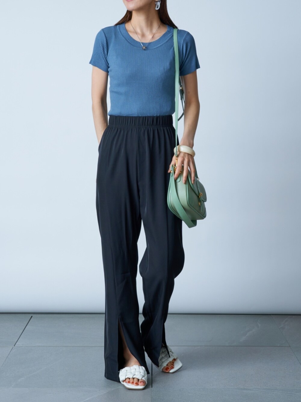 シンプルな大人の爽やかコーデ✨ ニットトップスは肌当たりが良くストレスフリーに着られます◎