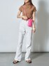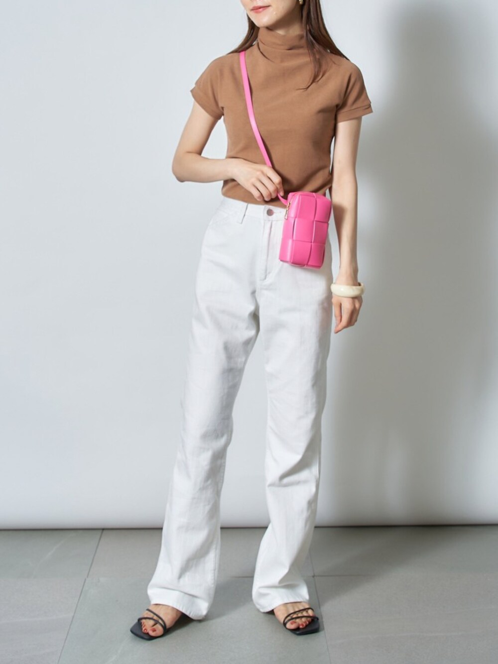 ワントーンコーデにピンクのバックを差し色にした女性らしいコーディネート🌷