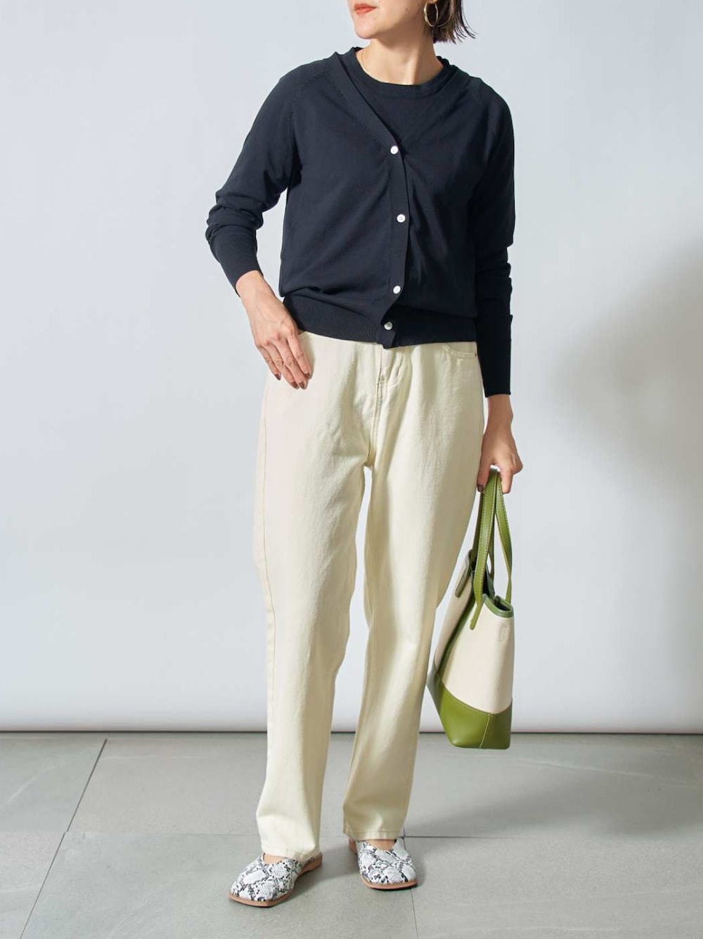 モノトーンで合わせた大人カジュアルスタイリング🌟小物でカラーや柄をプラスしたのがポイントです!