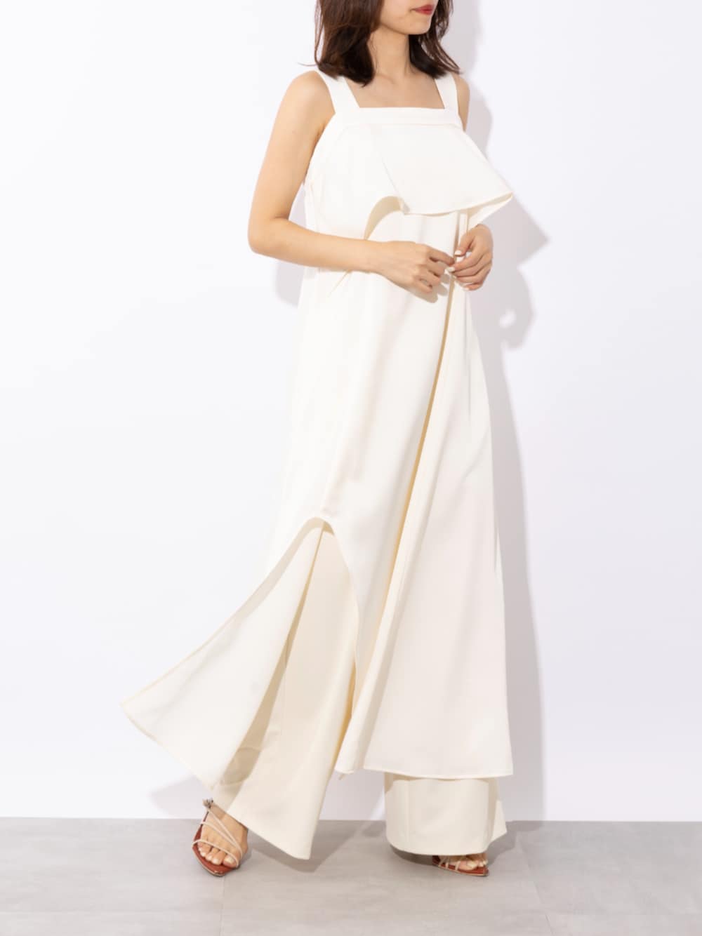 胸元のフリルとスリットがポイント◎ 一枚で着ても、パンツを合わせても可愛いロングワンピースです◎ モデル身長:152㎝