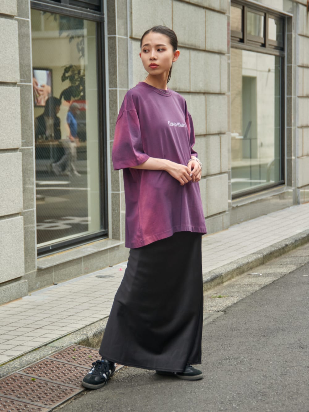 ビッグシルエットがこなれた雰囲気のTシャツにロングスカートを合わせた大人カジュアルスタイル! モデル身長:158㎝