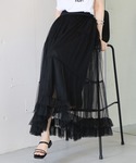 カジュアルスタイル ニット×チュールの異素材ドッキングトップス◎チュールスカートを合わせてワンピース風に! モデル身長:160㎝