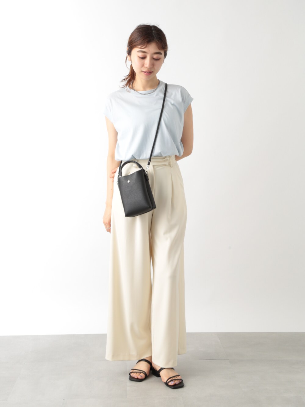 カジュアルスタイル シンプルな黒のミニバッグはどんなコーディネートにも合わせやすく、一つあると重宝しそうです。 モデル身長:160㎝