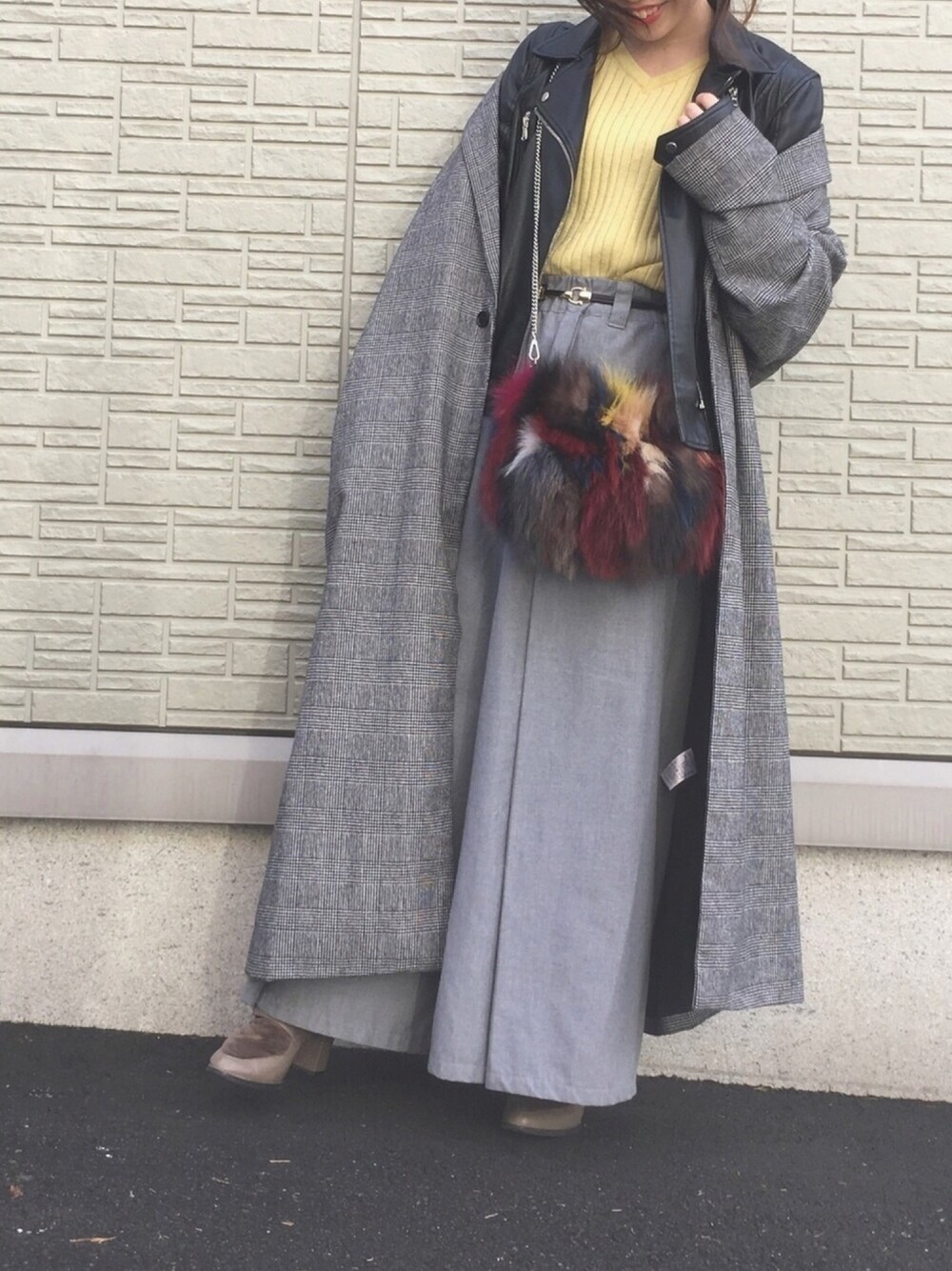🌈バック主役のコーディネート🌈 お気に入りのファーバックが目立つように、ライトグレーのパンツを合わせました! 👉今日のPoint ✅小顔効果 ・Vネック➕明るい色で顔まわりをスッキリ見せる! ・ワイドパンツで下半身にボリュームと、アクセントを持ってくることで目線を下に誘導することができ、小顔効果につながります✨