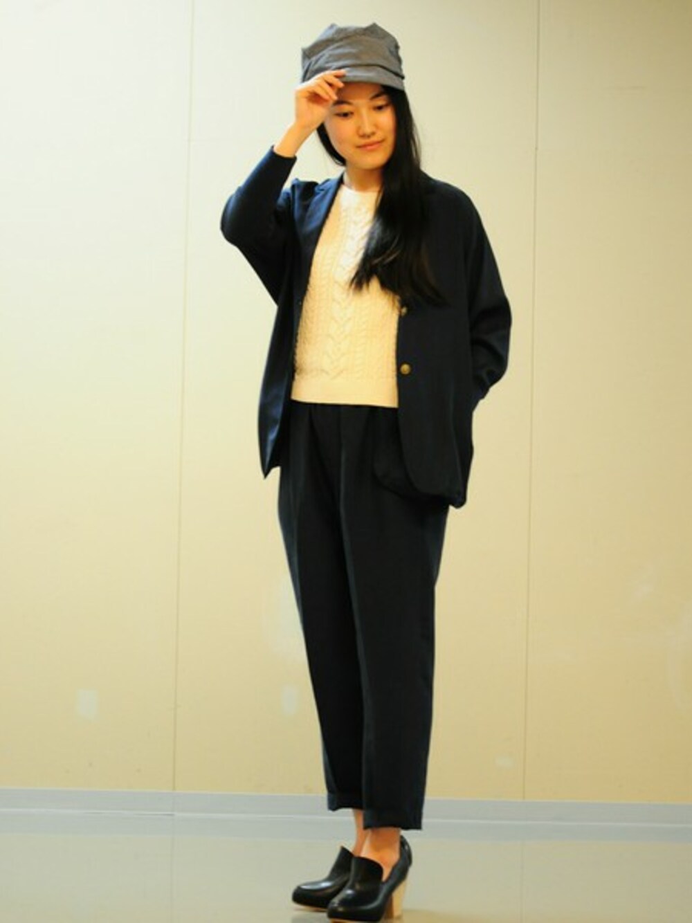 シルクセットアップのフォーマルスタイルにワークキャップで気張り過ぎないスタイルに。