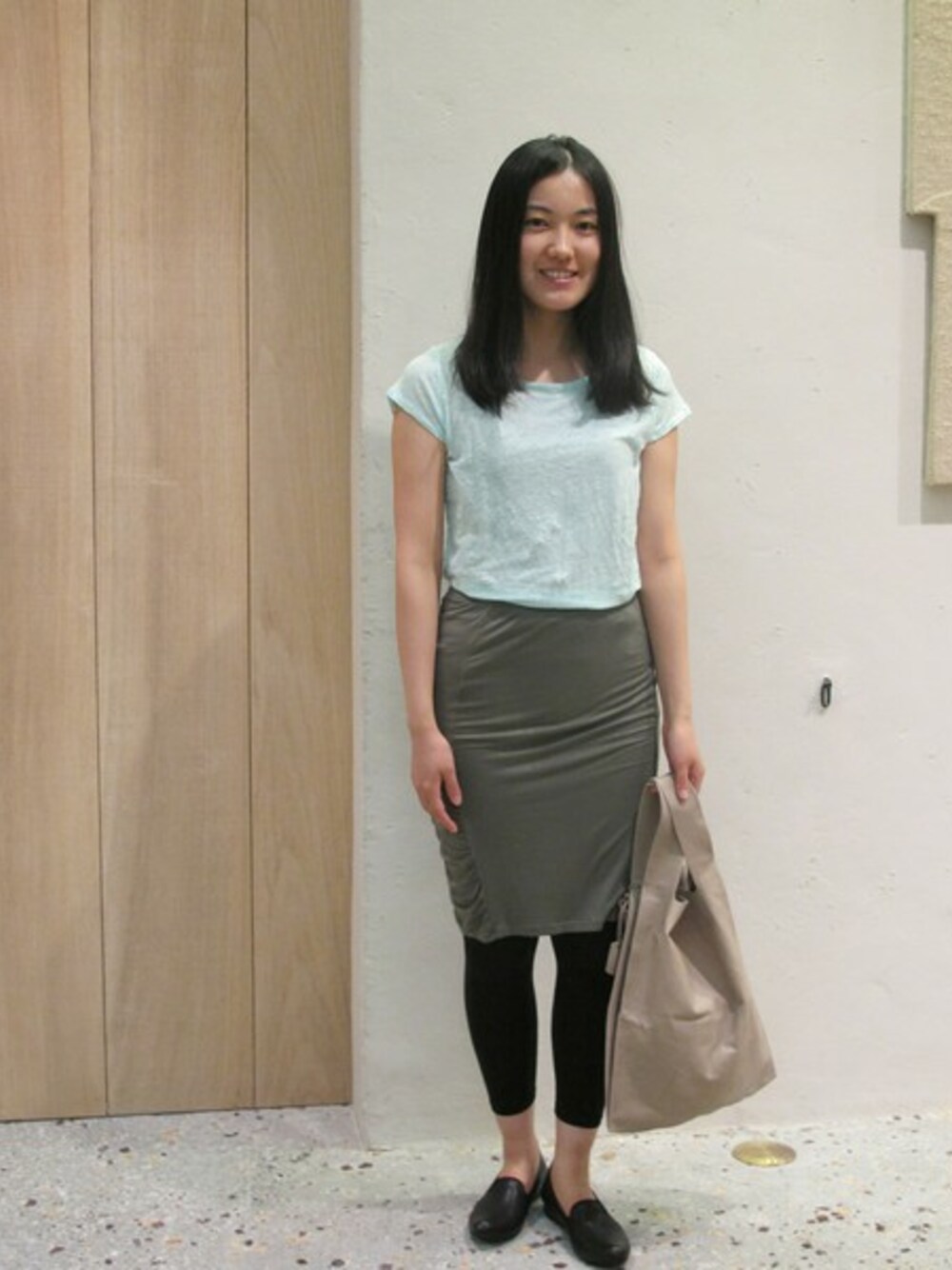 タイトスカートにさらっとした麻100%のカットソーをインしてすっきりコーディネートです。