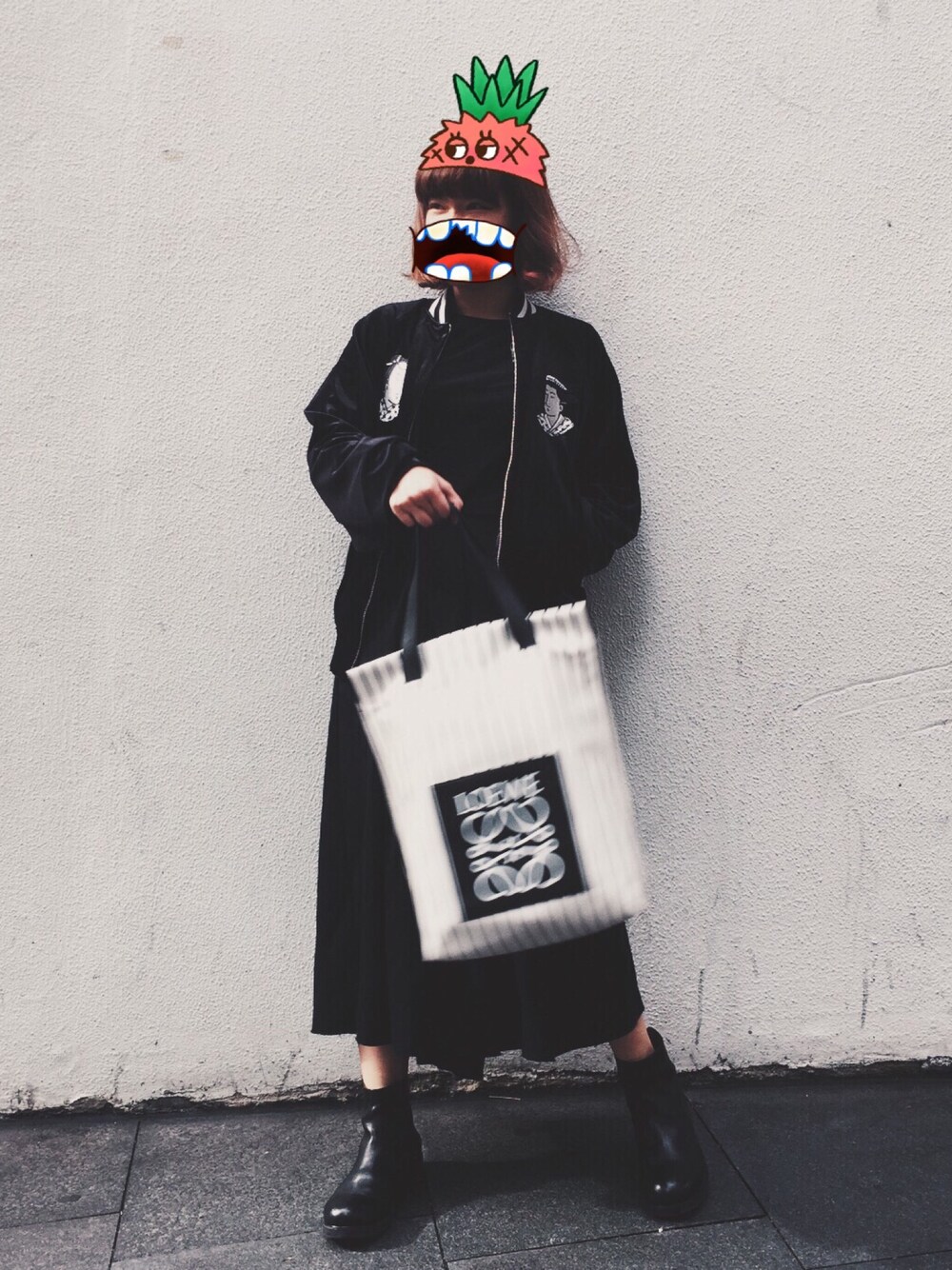 justmoustachegirlのトートバッグ「Loewe Striped North-South Shopper Bag, Black/White」を使ったコーディネート