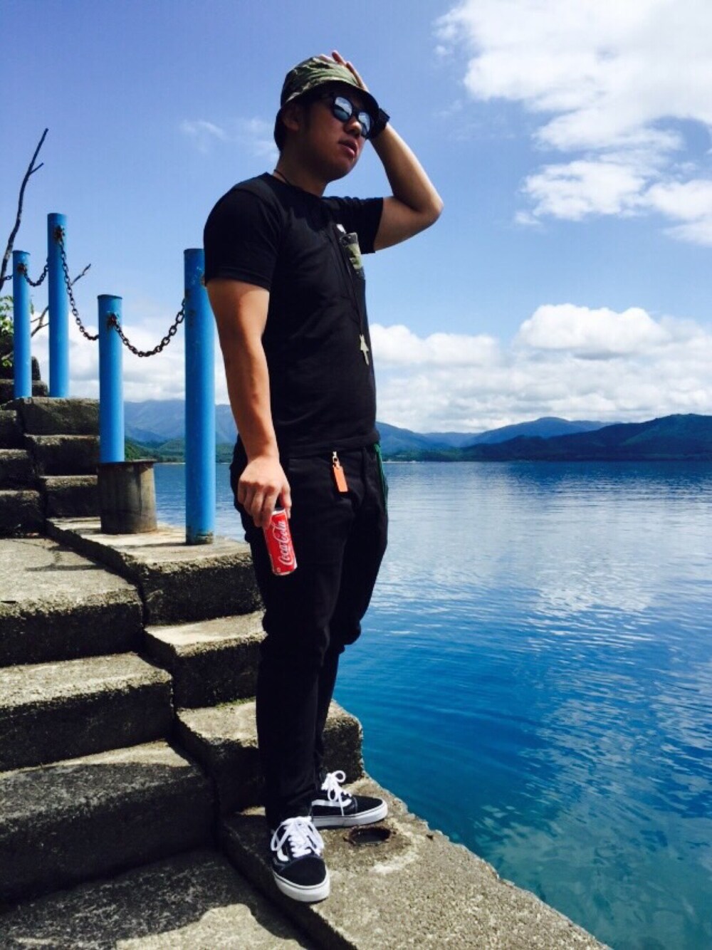 彼女と秋田うまいもんツアー。田沢湖をバックに撮影。