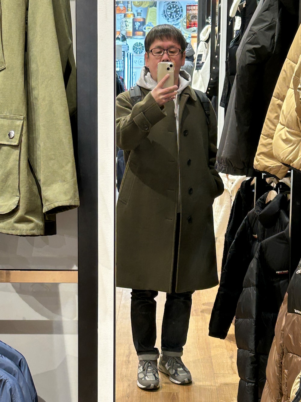 雨がしとしと降り、とても寒い日。コートを着ました。 スリムジーンズにニューバランスのM991。 雨の中でも滑らないので助かります。 バックパックはいつものジャンスポーツ。 これから喫茶店で熱いコーヒーでも飲みに行きます。