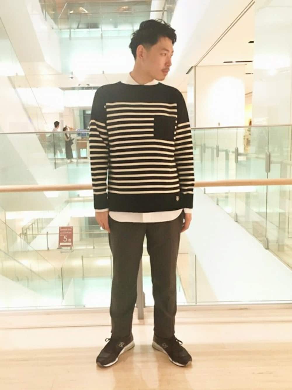 ORCIVALのニットを使ったモノトーンコーデです。 ゆとりのあるシルエットなので、シャツの重ね着も相性良く、細めのスラックスパンツと合わせれば、スマートな大人の雰囲気を楽しめます。
