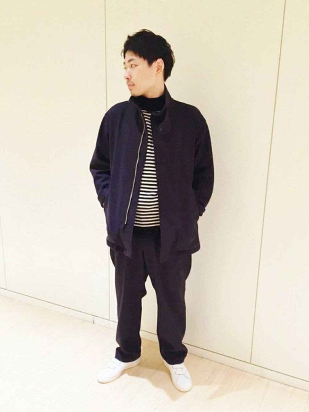 COMOLIのスタンドカラーのジャケットとベルテッドパンツは同素材アイテムのため、セットアップで着用するとカッコよさが倍増です。 ボトルネックのカシミヤニットは、着心地も暖かさ共に抜群。 足元は白色スニーカーで、爽やかにカッコよく着こなしてください。