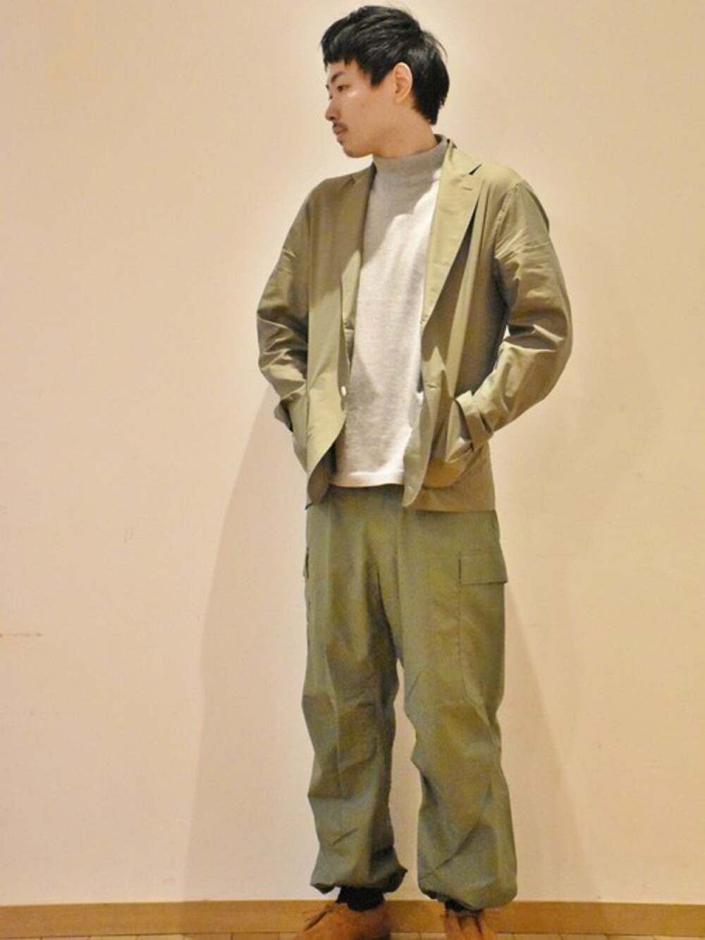 今期は柔らかで艶のあるシルク素材を使ったアイテムがおすすめです。 AURALEEのシルク混のジャケットは、ノーブルで緩やかな印象を与えてくれます。ミリタリーパンツやモックネックTEEと合わせれば、 シックに決まらず、アーバンで気取らないスタイリングに変わります。