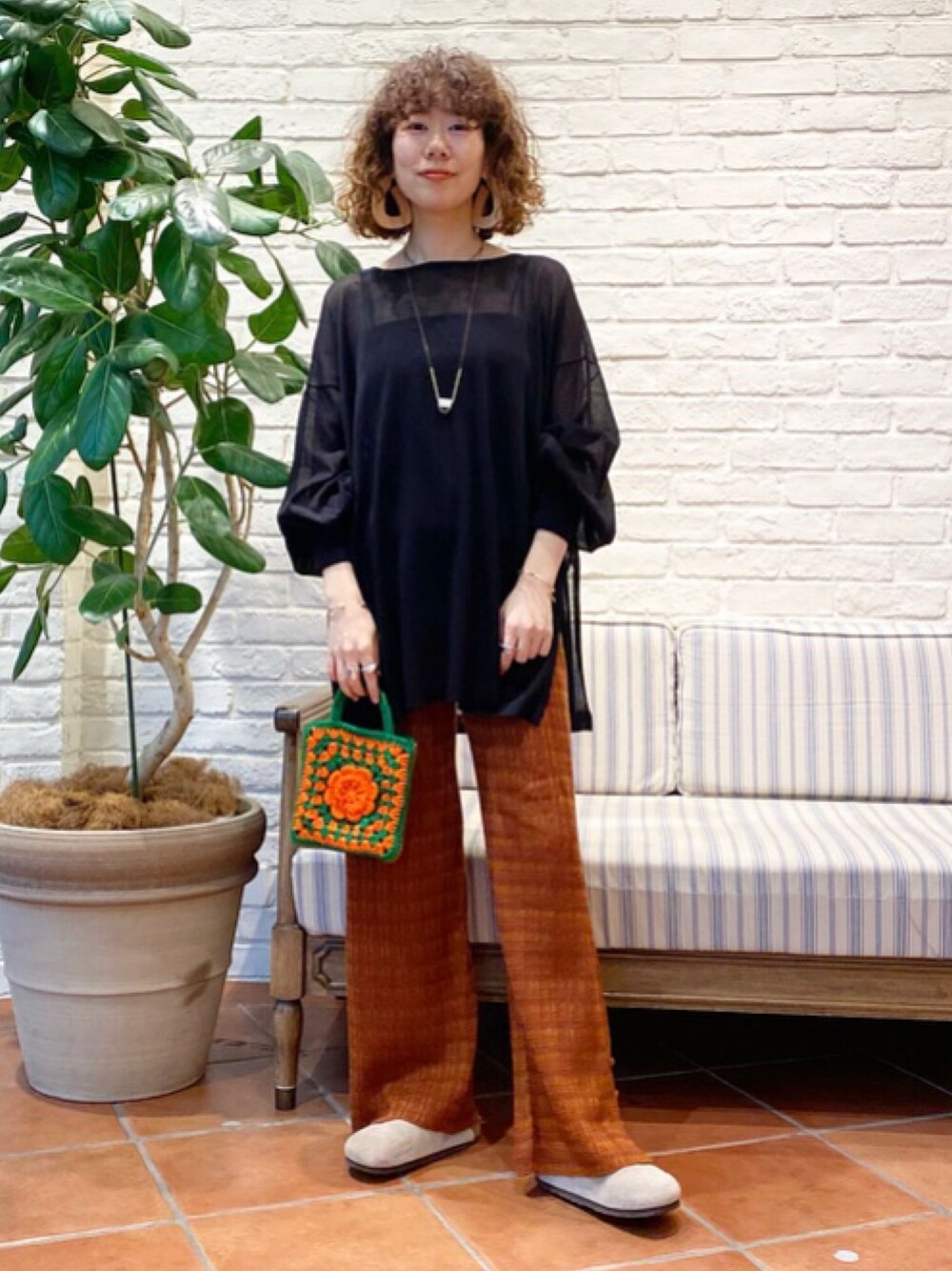 <RBS>のトップス、ベストを外してゆるく着ました。小物はスエードサンダルやニットバッグでよりリラックスした雰囲気に。