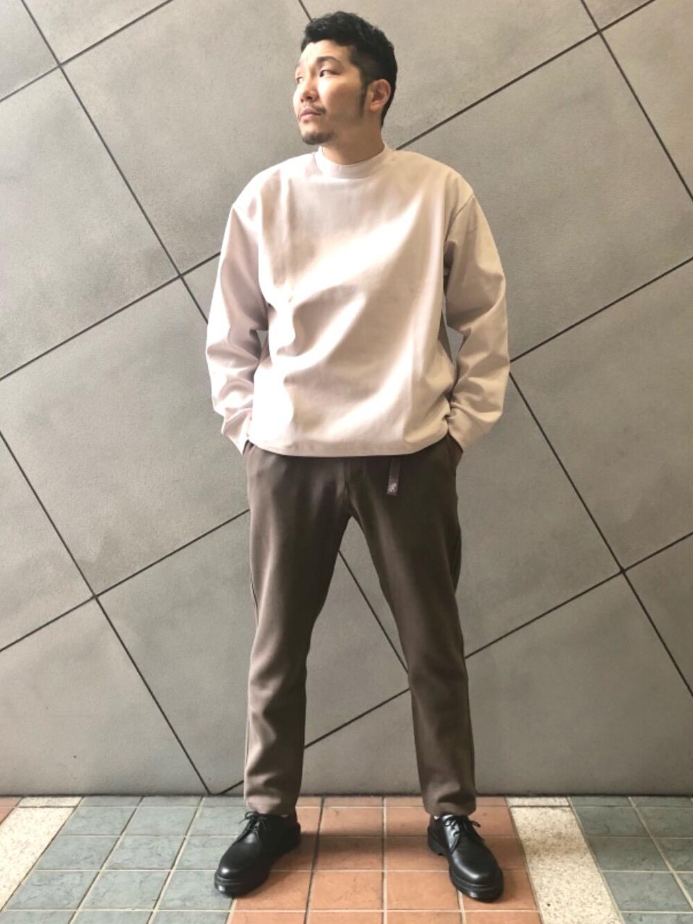 ●年齢:30代前半 ●身長:181㎝ ●普段サイズ:トップスLかXL、ボトムスLかXL、シューズ9 【サイズ感】 トップス:ゆったり ボトムス:ややタイト 【コーディネートのポイント】 モカ色のボトムスやシューズをポイントに上品な仕上がりにしました。