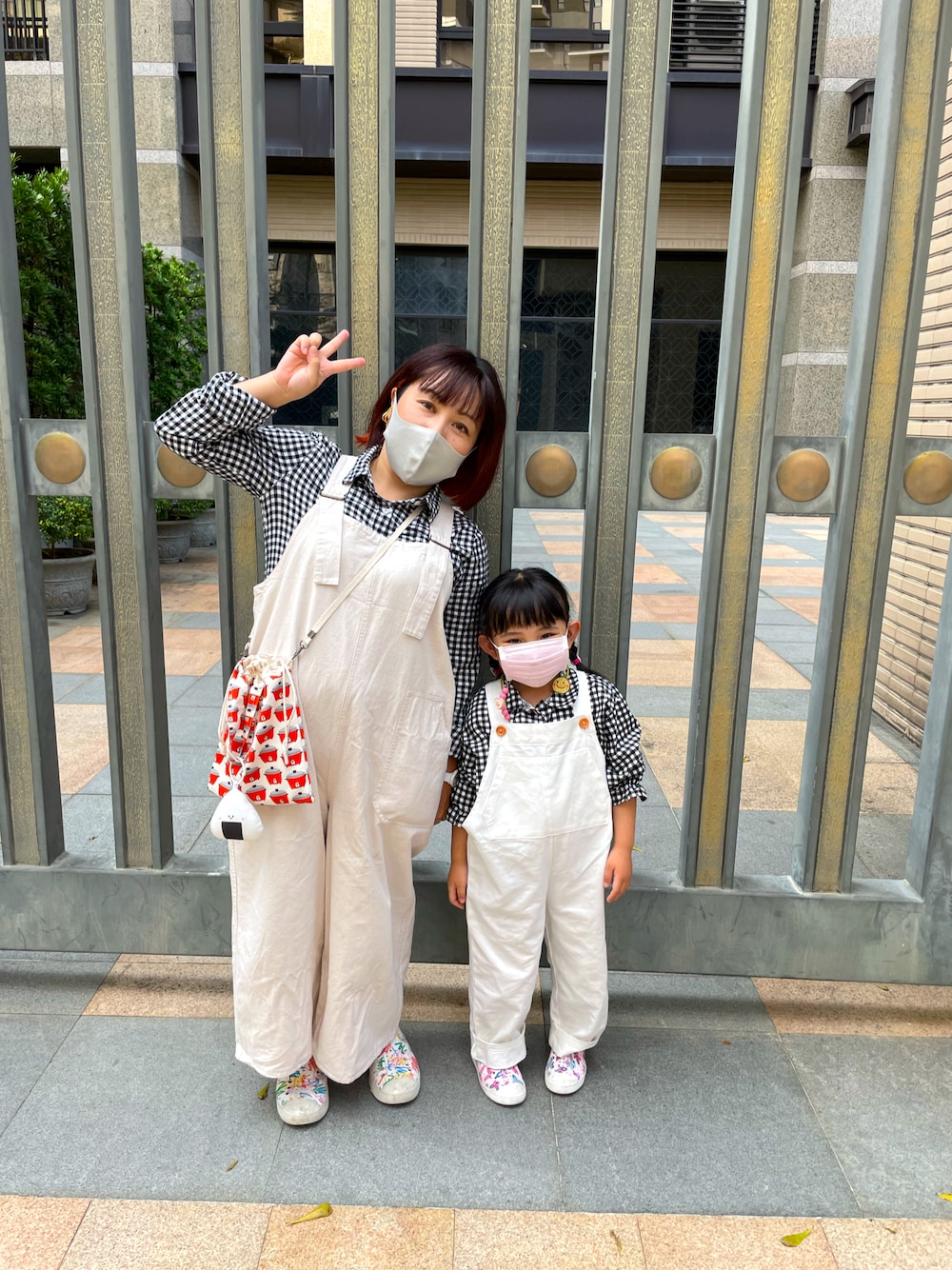 久しぶりにオールお揃い、オーバーオール😊 ギンガムチェック×白サロペの強さ😌 ダイエット諦めたことを隠せる頼り甲斐😂 (写真みて隠せてない事には気付いてるけど) 電鍋柄のポシェットにおにぎりつけてお気に入り🍙