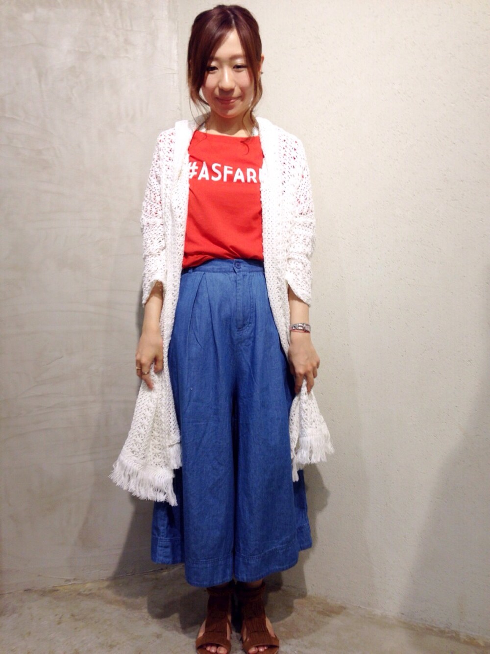 ガウチョパンツに派手色のTシャツ! シンプルだけど、Tシャツの形や カーディガンのフリンジなど 細かいところにこだわりが沢山(^○^)